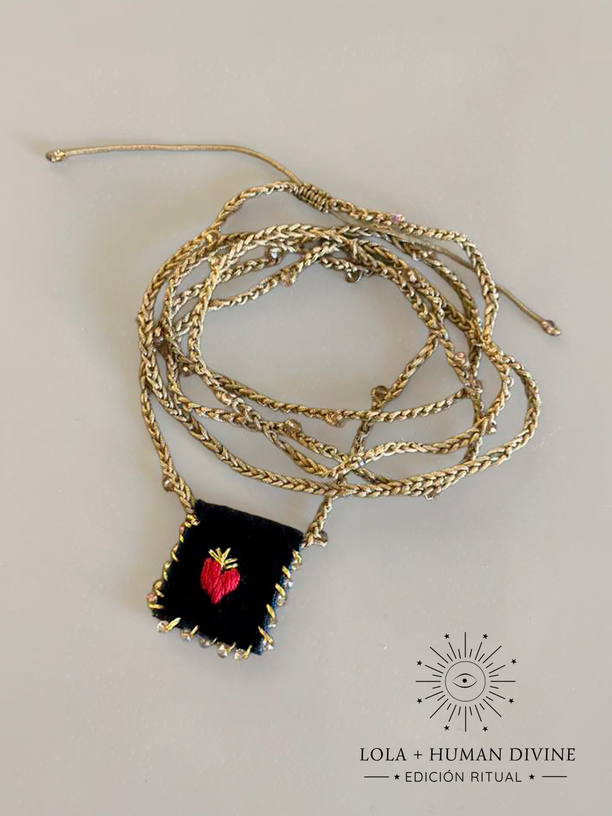 El Escapulario Divino está tejido con cordón trenzado en tono dorado suave, acompañado por delicadas cuentas que aportan brillo y movimiento. Su pequeño dije bordado, con un corazón rojo sobre fondo oscuro y la estrella del otro lado, simbolizan la chispa divina que vive en tu interior: amor, protección y presencia consciente en cada paso. Ligero, artesanal y lleno de intención, es una pieza pensada para acompañarte en tus rituales diarios, en tus prácticas espirituales o simplemente como recordatorio de tu energía y tu propósito.